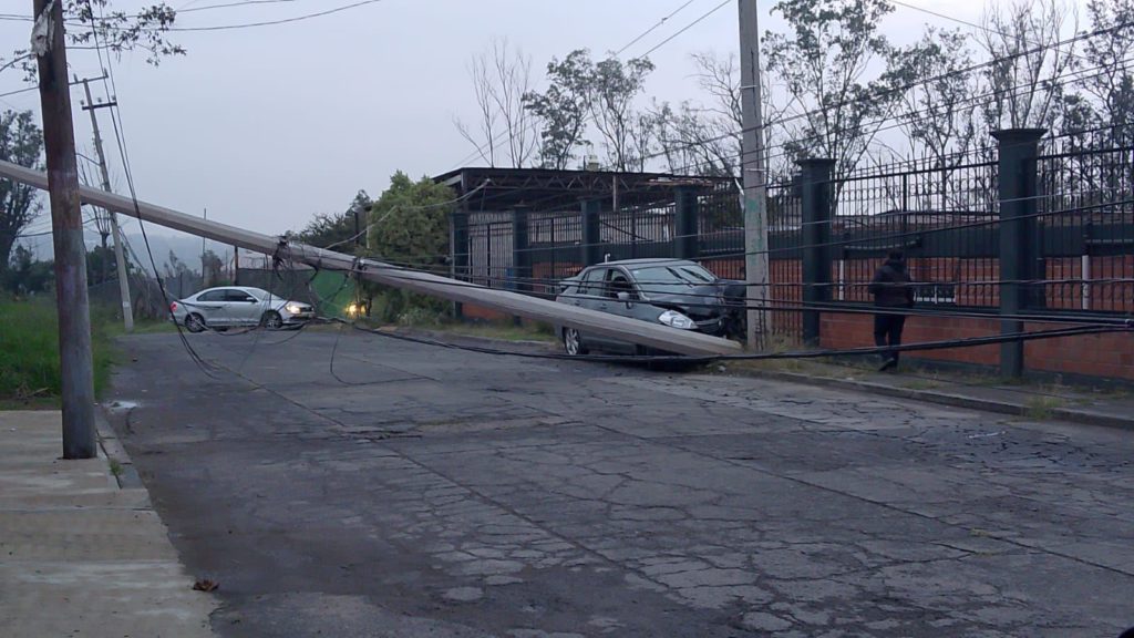 poste de luz en la calle Cisnes, en Lago de Guadalupe; la infraestructura cayó tras el impactos y el automovilista se dio a la