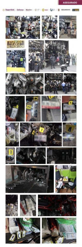 Elementos de la SSC ejecutaron 13 órdenes de cateo en inmuebles de las alcaldías Iztapalapa, Cuauhtémoc y Gustavo A. Madero, donde previamente se habían identificado puntos de desmantelamiento de vehículos y motocicletas ubicados en las colonias San Felipe de Jesús, Santa Cruz Meyehualco, Desarrollo Urbano Quetzalcóatl, Santa María Aztahuacán, Paraje Zacatepec, Barrio San Pablo, Exhipódromo de Peralvillo y Morelos.