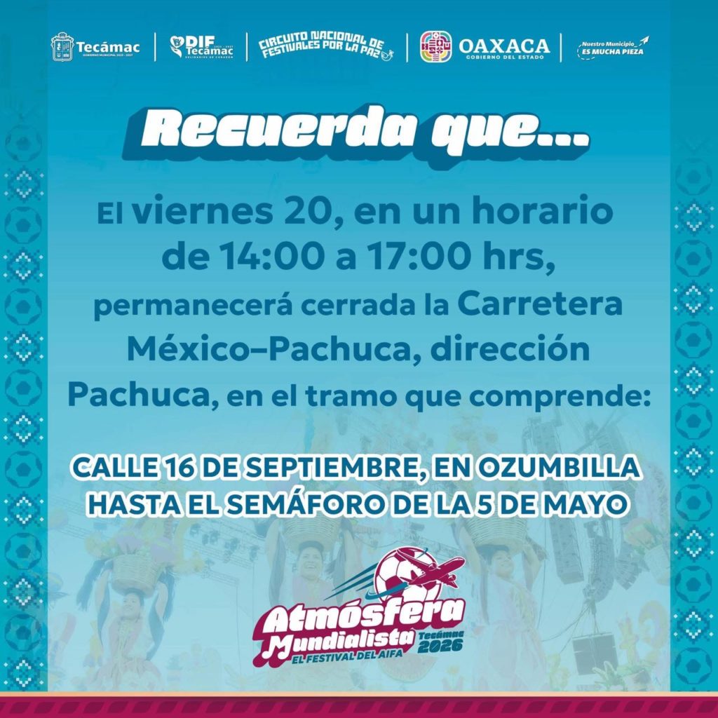 📍Tecámac Edomex | 20 Marzo 2026 Con motivo del Convite de la Guelaguetza, representación de la cultura de Oaxaca, el estado de honor invitado al Festival Atmósfera Mundialista 2026, se realizará un cierre parcial a la carretera federal México-Pachuca en dirección a Pachuca este 20 de marzo en un horario de 14:00 a 17:00 […]