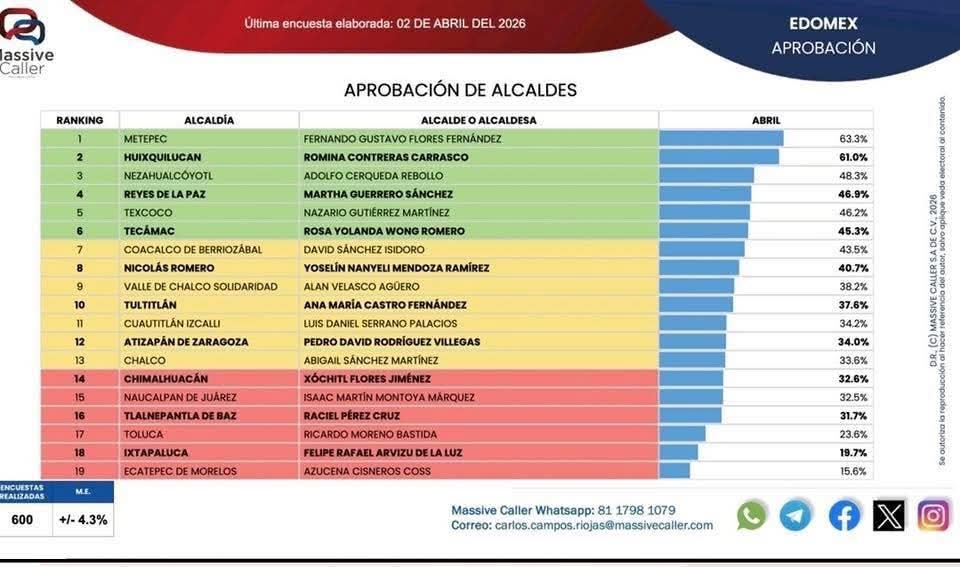 📍La Paz Edomex | 05 Abril 2026 Por. Gaby Hernández La presidenta municipal de Martha Guerrero Sánchez, en La Paz, Estado de México, se colocó en el cuarto lugar del ranking de aprobación de alcaldes del Estado de México, de acuerdo con la más reciente encuesta elaborada por la empresa Massive Caller el 2 de […]
