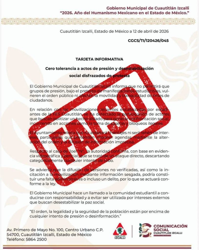 📍Cuautitlán Izcalli | 17 Abril 2026 Respecto a la imagen de un texto que se difunde en redes sociales yque pretende hacerse pasar por una tarjeta informativa de esteGobierno Municipal –en la que se acusa que el movimiento deestudiantes de la FES Cuautitlán es ilegítimo–, este Ayuntamientoaclara que se trata de un texto apócrifo, que […]
