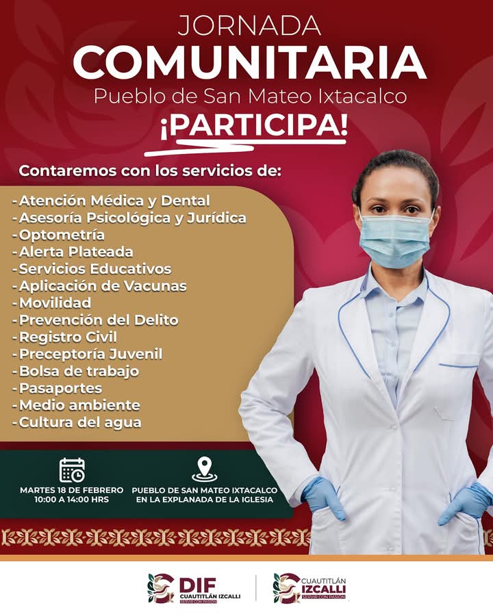Las Jornadas Comunitarias del DIF llegan a su comunidad, mañana estarán en el Pueblo de San Mateo Ixtacalco. Encuéntranos mañana en la explanada de la iglesia, de 10:00 am a 2:00 pm.