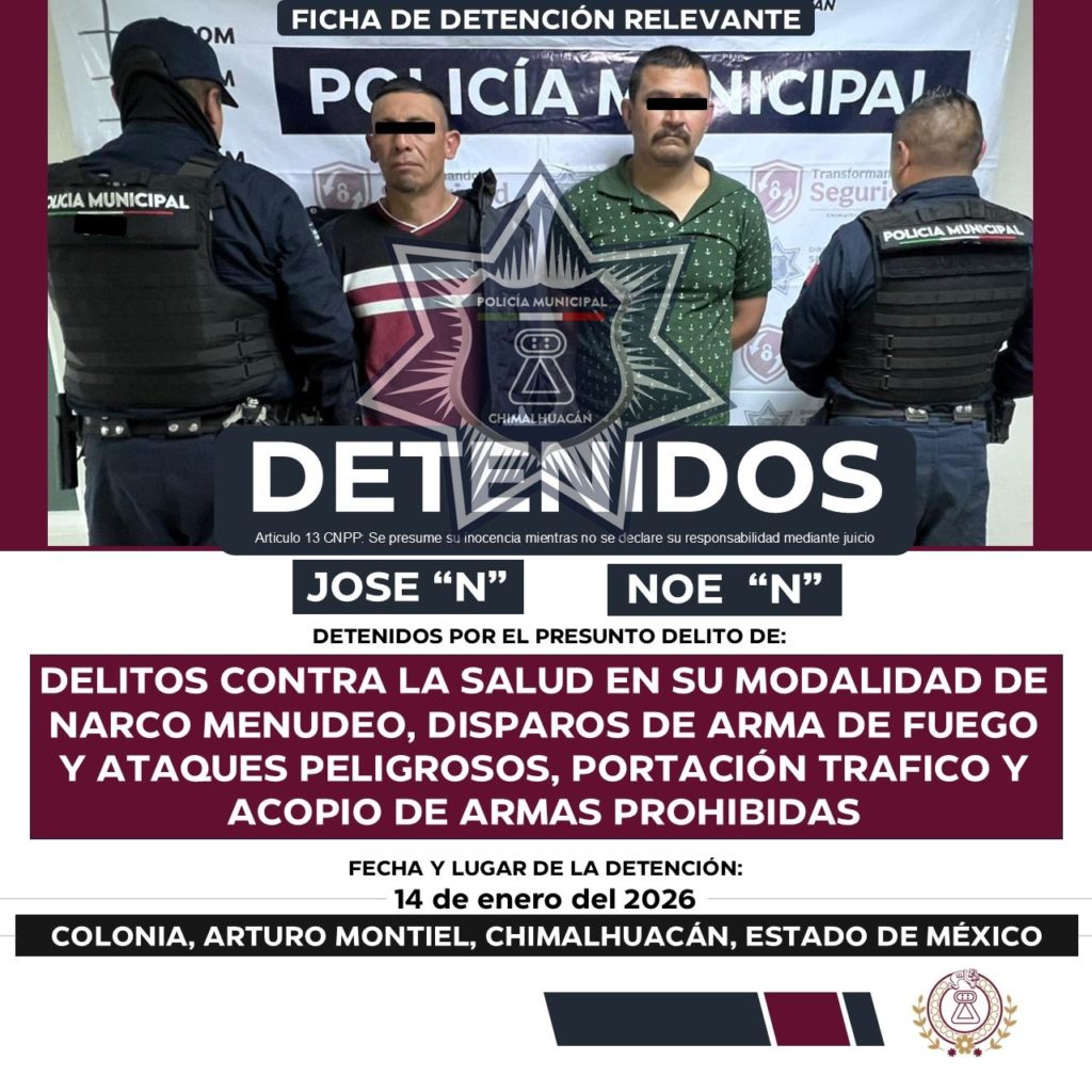 📍Chimalhuacán Edomex | 28 Enero 2026 Elementos de la policía municipal de Chimalhuacán realizaron la detención de cuatro personas, tres hombres y una mujer, durante distintos operativos de patrullaje preventivo en las colonias Acuitlapilco y Arturo Montiel, como parte de las acciones permanentes para fortalecer la seguridad en el territorio. El primer hecho ocurrió durante […]