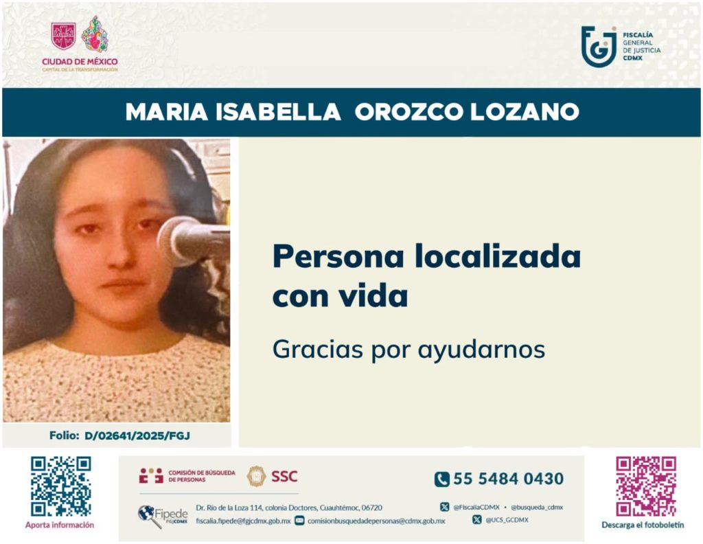📍 CDMX FGJCDMX | 9 Octubre 2025 Por. Manuel Zepeda La Fiscalía General de Justicia de la Ciudad de México (FGJCDMX) y la Comisión de Búsqueda de Personas (CBP) localizaron con vida a María Isabella Orozco Lozano, de 16 años, quien contaba con un reporte de desaparición emitido el pasado 9 de septiembre. De acuerdo […]