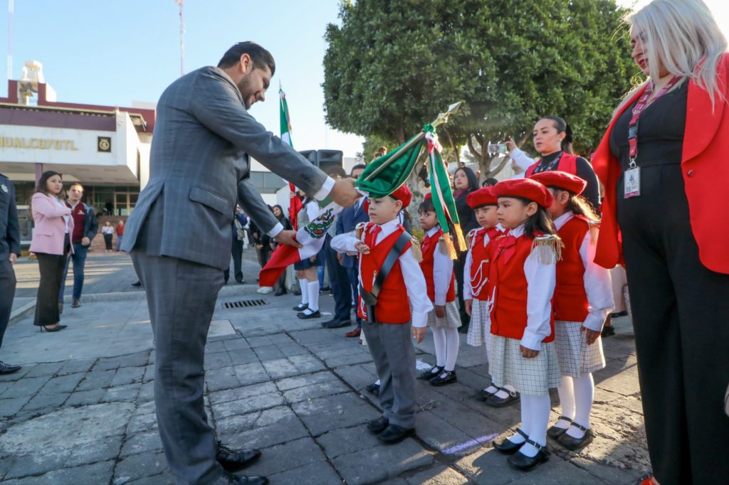 El presidente municipal de Nezahualcóyotl, Adolfo Cerqueda Rebollo, encabezó la ceremonia conmemorativa por el 85 aniversario de la Bandera de México en la Explanada del Palacio Municipal. Estuvo acompañado por Severiano del Toro, encargado de la Subdirección Regional de Educación Básica de Nezahualcóyotl, en representación de la gobernadora del Estado de México, Delfina Gómez, así como por integrantes de su gabinete y del Cabildo.