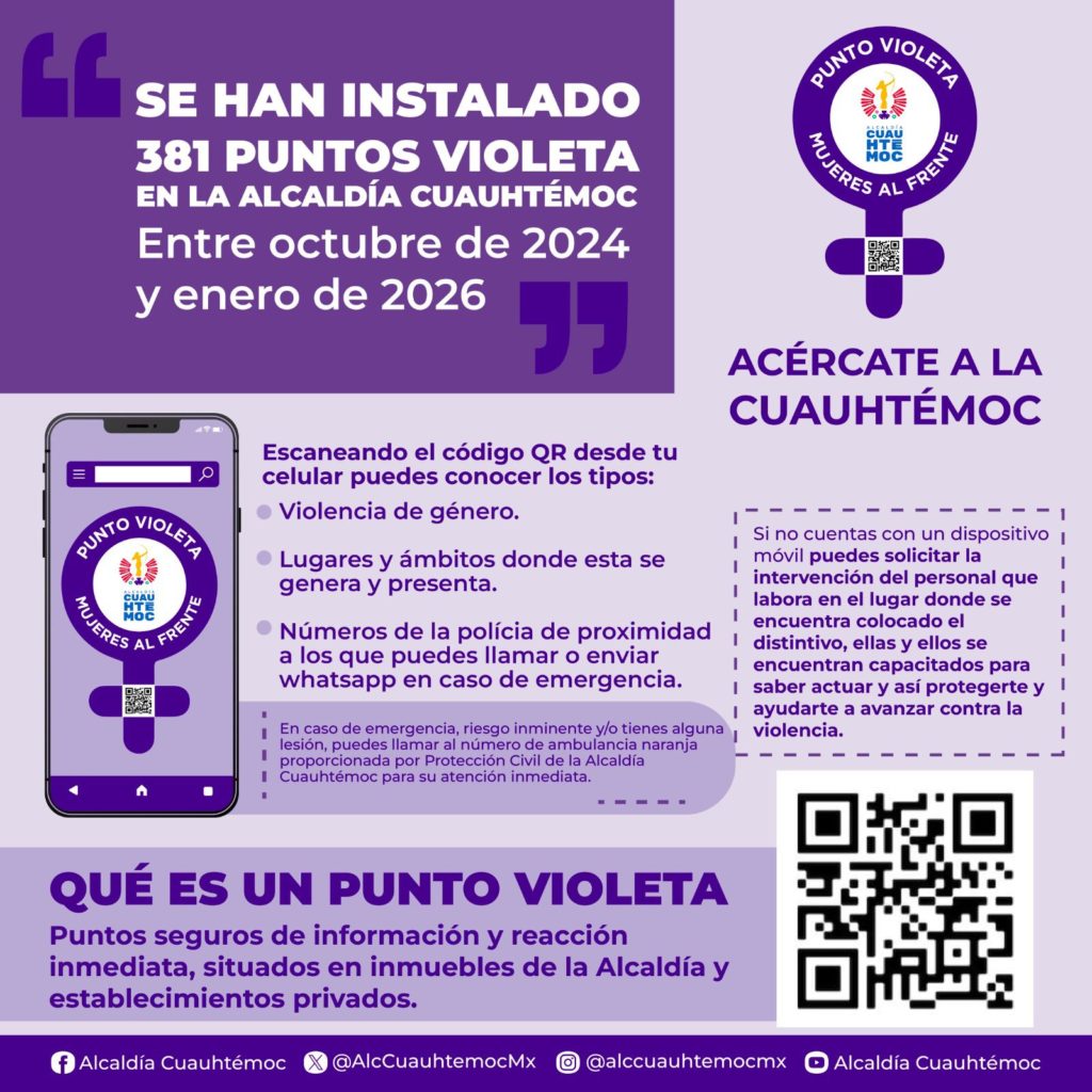 Entre octubre de 2024 y enero de 2026 se han instalado 381 Puntos Violeta en toda la demarcación. Estos espacios funcionan como puntos seguros de información, resguardo y reacción inmediata, y se ubican tanto en inmuebles de la alcaldía como en establecimientos privados.