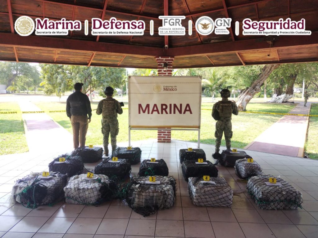 En una operación marítima encabezada por elementos de la Secretaría de Marina (Semar) a través de la Armada de México en funciones de Guardia Costera, en coordinación con la Secretaría de Seguridad y Protección Ciudadana (SSPC) y la Fiscalía General de la República (FGR), durante operaciones de vigilancia y seguridad marítima, se realizó la detención de seis presuntos infractores de la ley a bordo de una embarcación menor con tres motores fuera de borda, con 14 bultos tipo costalilla conteniendo en su interior 580 paquetes tipo ladrillo con polvo blanco con características similares al clorhidrato de cocaína, con un peso aproximado de 650 kilogramos (mismo que será confirmado por la autoridad ministerial correspondiente), así como 350 litros de combustible.
