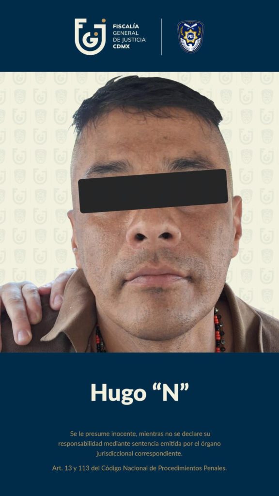 La Fiscalía General de Justicia de la Ciudad de México (FGJCDMX) aprehendió a Hugo “N”, de 45 años, por su probable participación en el delito de feminicidio calificado. Fue trasladado al Reclusorio Preventivo Varonil Oriente, donde quedó a disposición de la autoridad judicial competente.