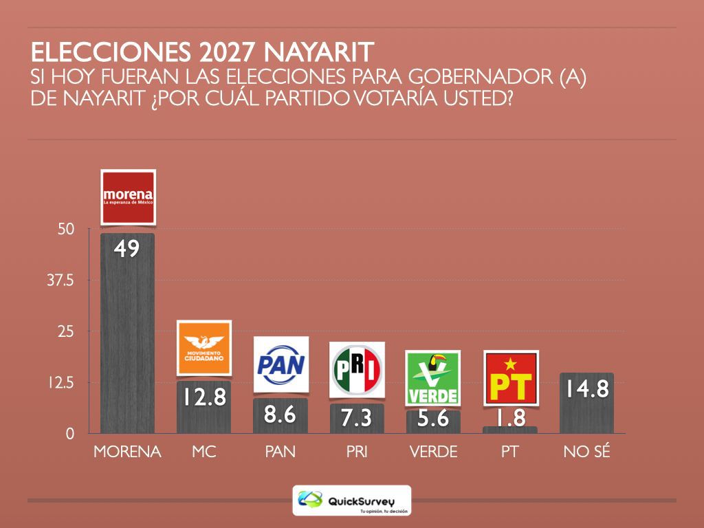 De acuerdo a una encuesta de “QUICK SURVEY – Tu Opinión, Tu Decisión”, realizada en enero para conocer la tendencia con rumbo a la elección de gobernador (a) 20 27, se establece que por Partido Morena mantendría una holgada ventaja en la contienda.