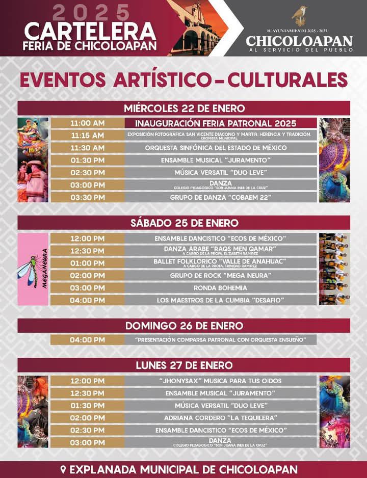 El Gobierno de Chicoloapan invita a las vecinas y vecinos a disfrutar de la Feria de Chicoloapan 2025, un evento lleno de tradición, arte y cultura que se llevará a cabo en la explanada municipal del 22 de enero al 27 de Enero.