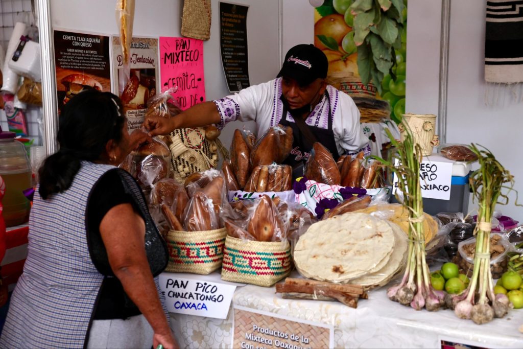 Celia Martínez Juárez, originaria de San Bartolomé Yucuañe, Tlaxiaco, Oaxaca, participa con productos auténticos de su tierra: totopos, pan de cemita, pan de pico, limas, ajos, pinole, frijoles, chocolate y piloncillo 🍞🌽🍫.