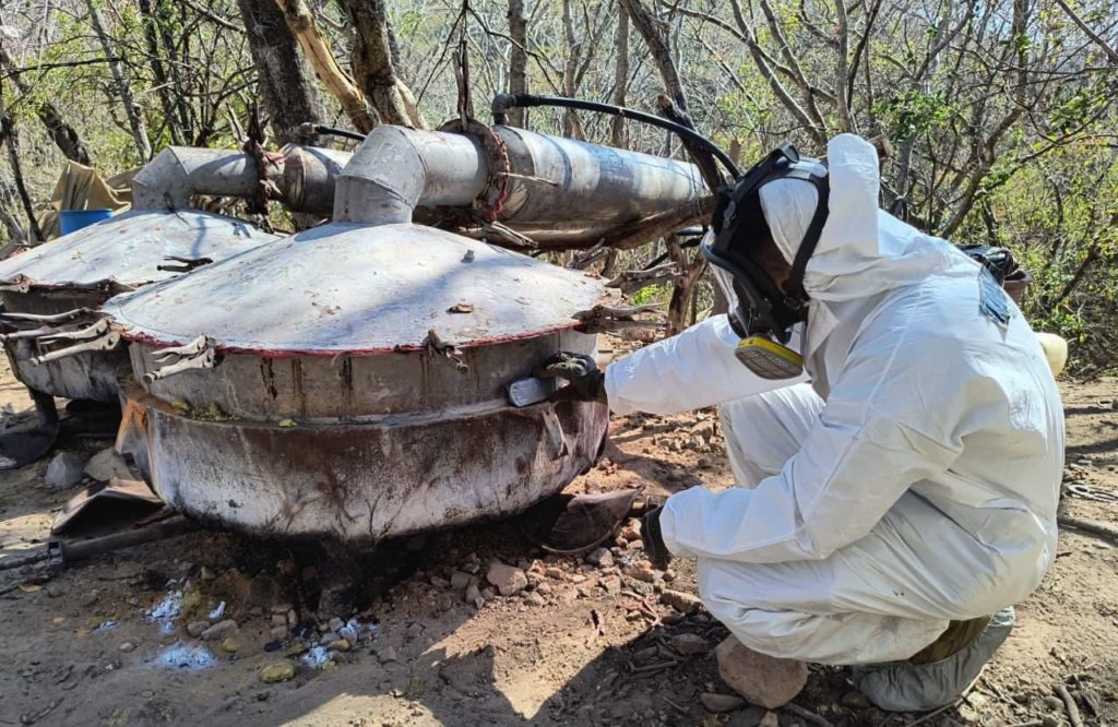 La Secretaría de Marina a través de la Armada de México, por conducto de la Octava Zona Naval, informa que ayer, elementos navales en coordinación con personal de la Fiscalía General de la República (FGR) localizaron y neutralizaron un Laboratorio Clandestino presuntamente dedicado a la producción de metanfetamina, en inmediaciones del poblado La Palma, municipio de Cosalá, Sinaloa. Esta acción se llevó a cabo durante patrullajes de vigilancia aérea y terrestre, durante los cuales se localizó y aseguró un Laboratorio Clandestino, en donde fueron destruidos aproximadamente mil litros de Fenil-2 Propanona, 400 litros de tolueno y 100 kilogramos de sosa caústica. El laboratorio contaba con extensas áreas de operación, materiales y accesorios para la producción de droga sintética, entre ellos: dos reactores con capacidad de 500 litros, dos condensadores con capacidad de 200 litros, dos tambos con capacidad 200 litros, 37 bidones con capacidad de 50 litros, 14 cilindros de gas licuado de pretroleo, un motogenerador, un ventilador, dos bombas sumergibles, seis quemadores, dos carretillas, dos palas de mezclado, 35 pinzas de presión y una barreta, siendo inhabilitados en su totalidad para evitar su reutilización. Este aseguramiento representa un golpe significativo a las estructuras logísticas de la delincuencia organizada, evitando con estas sustancias ilícitas lleguen a las calles, contribuyendo a la seguridad de las familias mexicanas. De esta manera la Secretaría de Marina a través de la Armada de México, refrenda su compromiso de trabajar en coordinación con las autoridades de los tres niveles de gobierno, para garantizar la seguridad, la paz y el bienestar de la población.