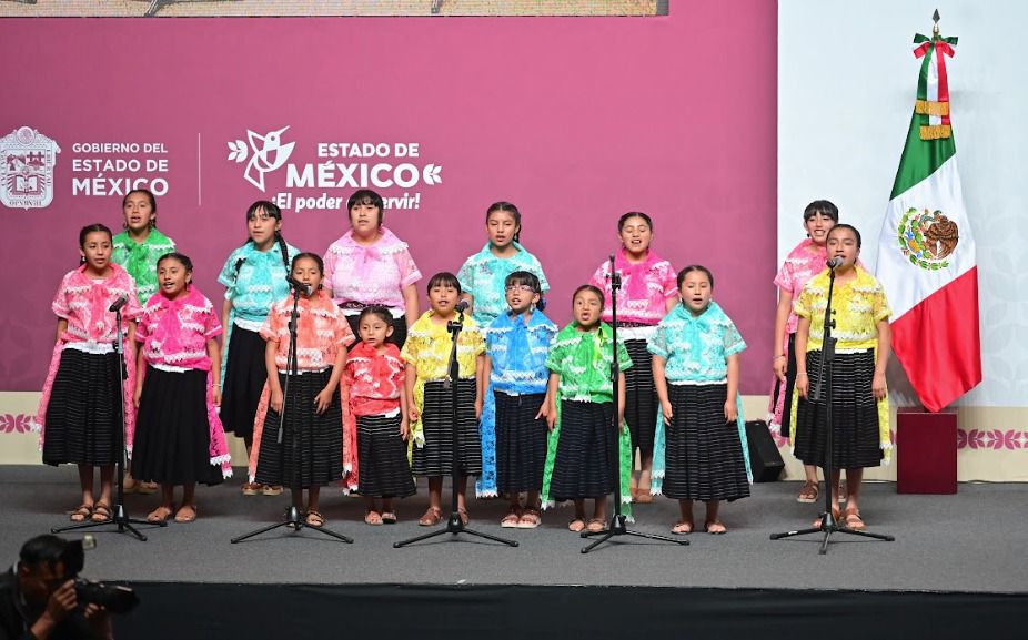 El coro infantil Ñhato Nthekunthe de Temoaya, que interpretó la canción “Pobrecito Guajolote” en español y otomí al inicio del evento en el Teatro Morelos.