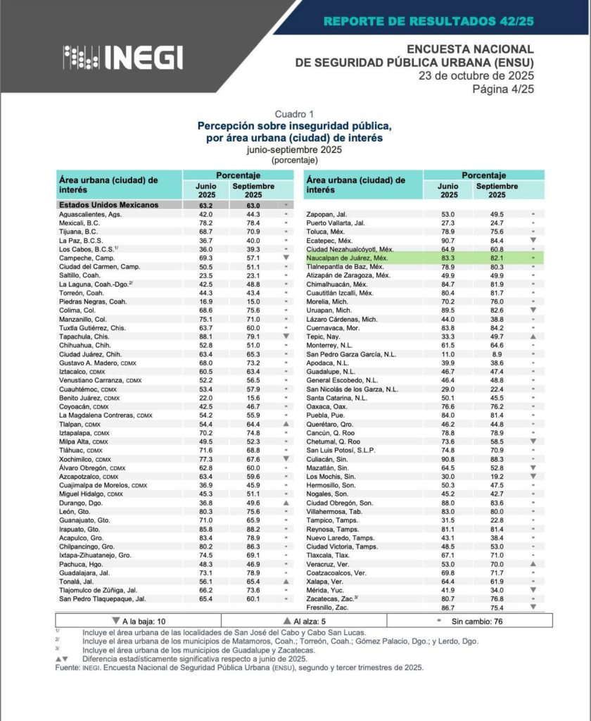 De acuerdo a ENSU, en comparación con 2024 que Naucalpan registró 89.2% de percepción de inseguridad, en junio de 2025, registró una disminución de 6 puntos, con el 83.3% y en octubre se mantiene a la baja con 82.1%.